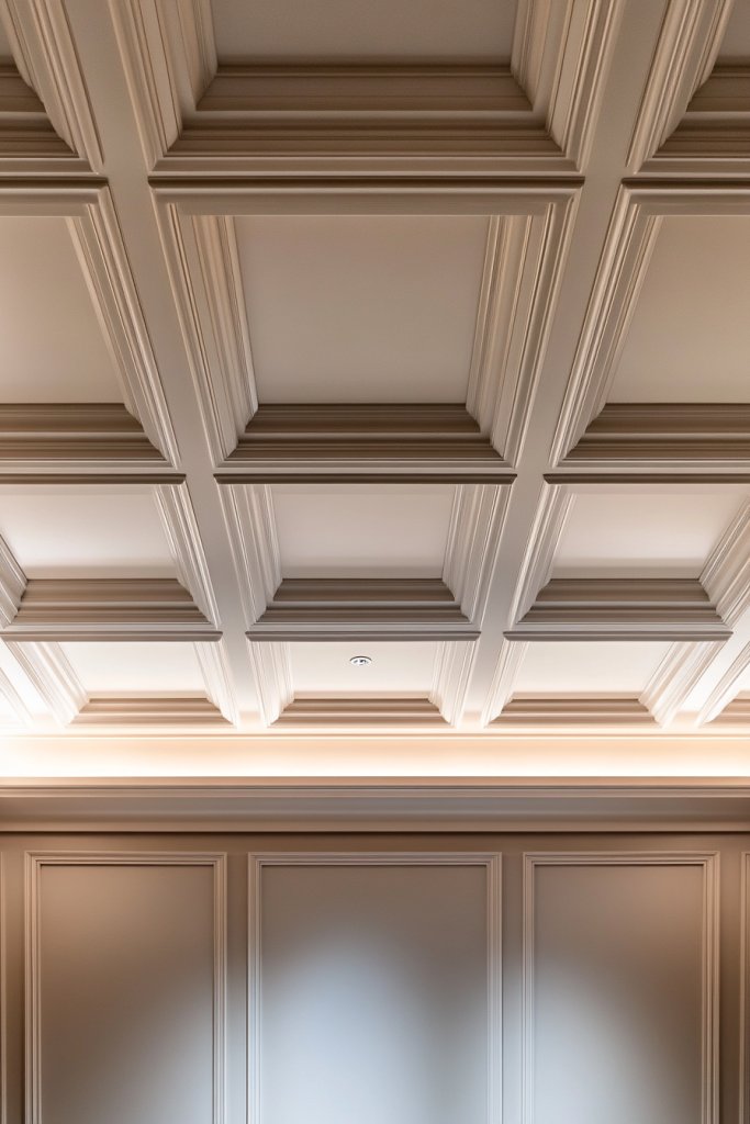 Visualize a ceiling with intricately detailed molding outlining each coffer, painted in muted neutrals or pastels. The soft colors soften the ornate details, making the space feel calm yet opulent. The subtle shadows cast by the molding add depth and dimension, creating a layered visual effect. The overall ambiance is one of gentle luxury, perfect for bedrooms or formal sitting rooms.
