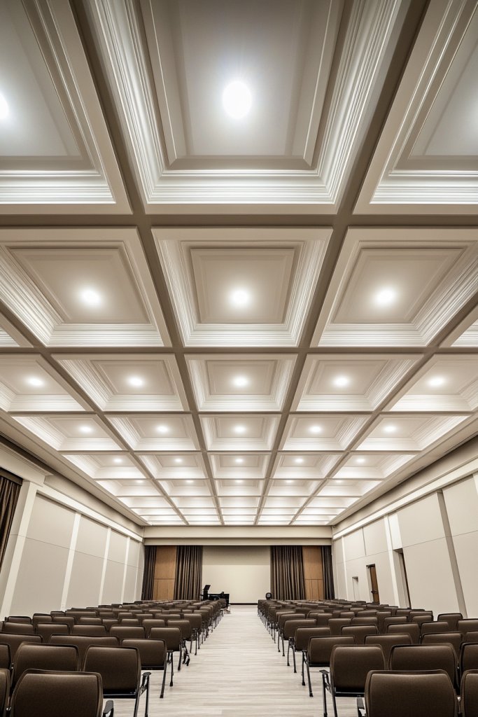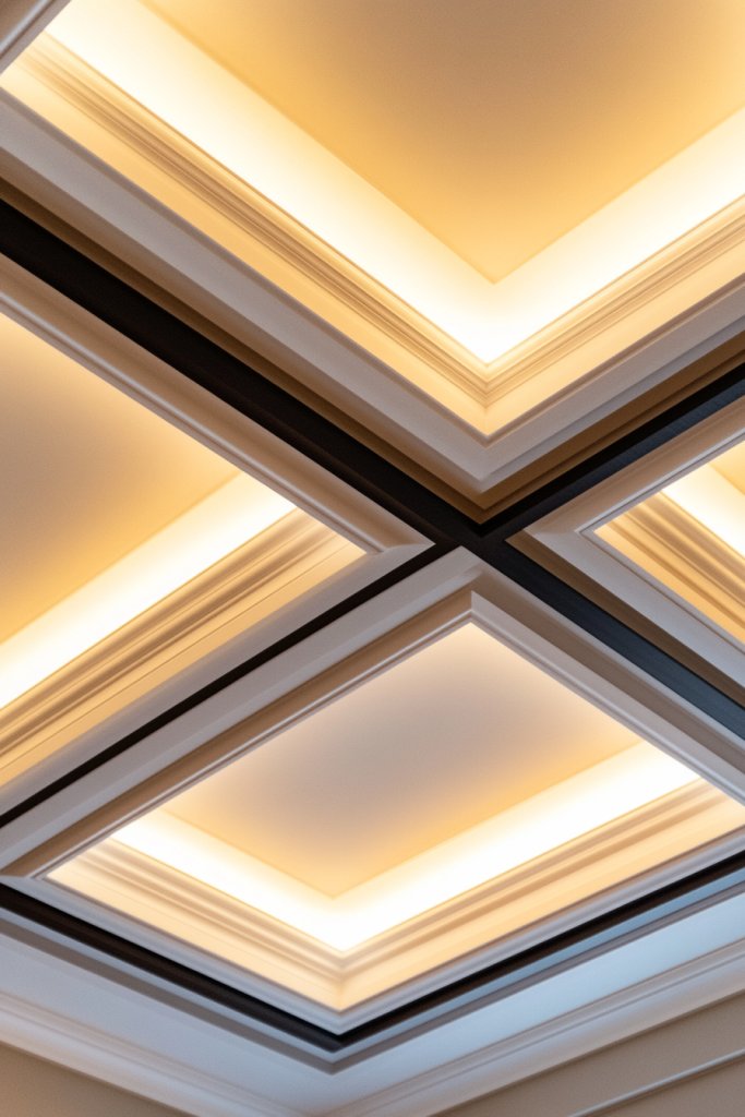 Visualize a ceiling where each coffer is edged with hidden LED strips, casting a soft, diffused light downward. The light accentuates the geometric pattern, adding depth and a contemporary vibe. Shadows and highlights dance across the panels, creating a dynamic visual effect. The room feels brighter and more inviting, perfect for entertaining or relaxing.