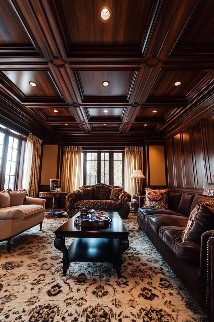 Picture deep stained wood panels forming a grid across your ceiling, their grain patterns adding texture and depth. The rich hues absorb ambient light, creating a soft, inviting glow. When paired with warm-colored walls and plush furnishings, the overall effect is one of understated luxury. The contrast between the dark wood and lighter walls emphasizes the coffered design, drawing the eye upward.