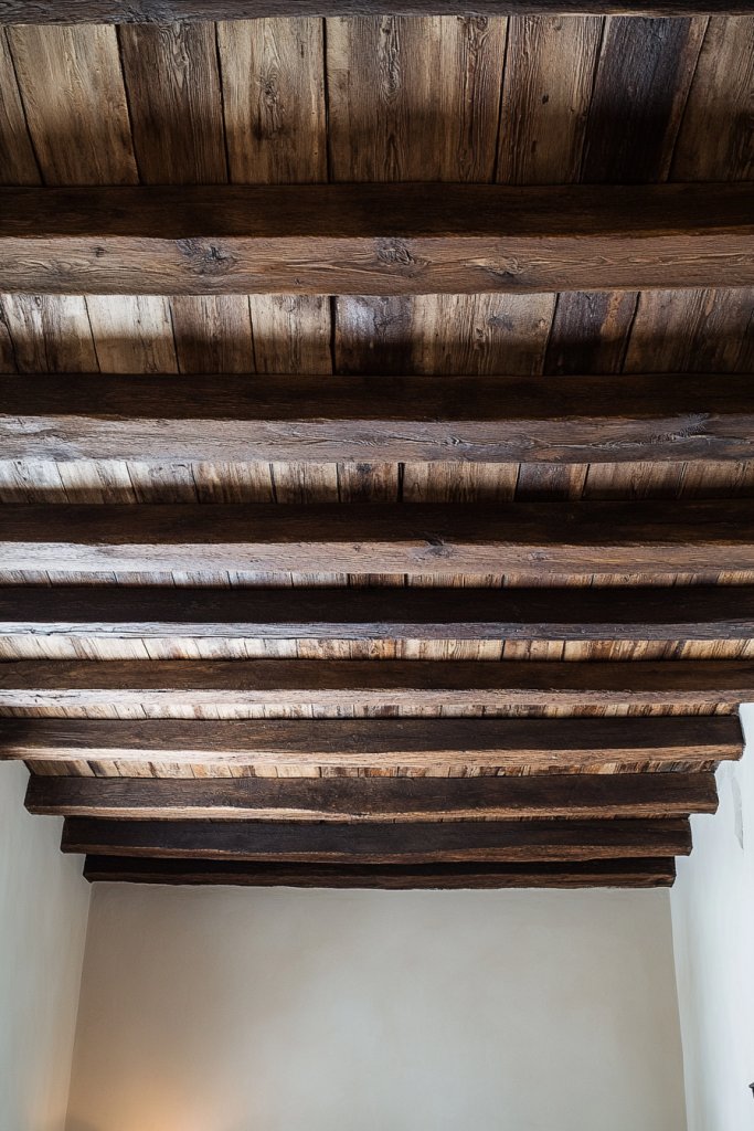 Picture wide, faux or real wooden beams crossing a ceiling in a grid pattern, with the natural grain and knots on full display. The beams are stained in warm tones, contrasting beautifully with neutral or painted walls. The open, airy feel created by the beams adds height and dimension to the room. Soft lighting or candles underneath enhance the rustic ambiance.