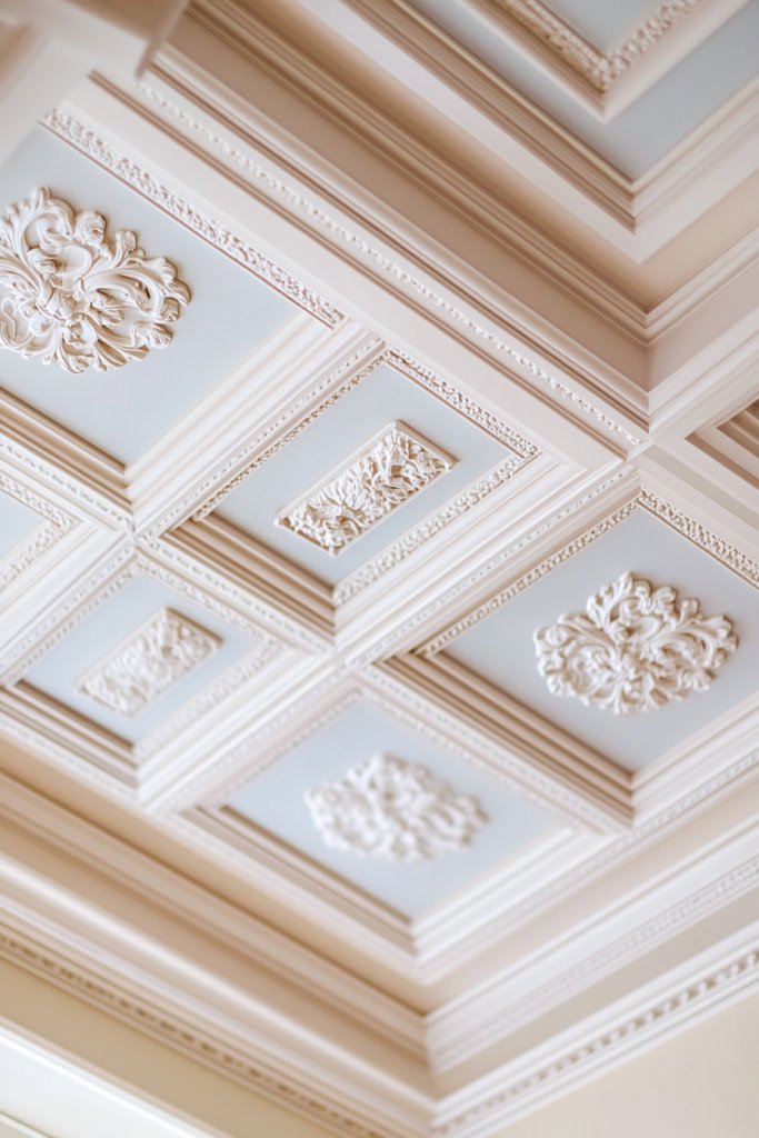 6. Ornate Coffers with Subtle Molding and Soft Color Palette