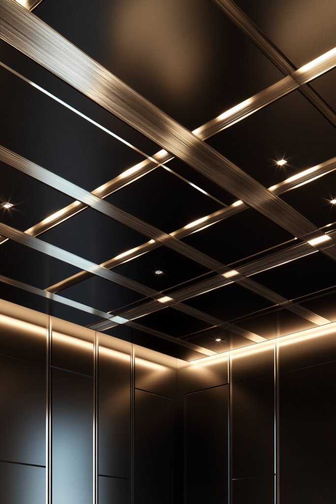 Imagine a ceiling with recessed panels framed by sleek metal strips—brass, chrome, or black matte—creating a geometric pattern. The metal accents catch the light, adding shimmer and contrast against the matte or painted surface. The clean lines and reflective surfaces evoke a sense of modernity and refined taste. It’s like jewelry for your ceiling, subtle yet striking.