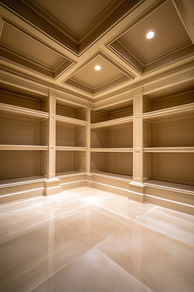 Picture a ceiling with beautifully crafted coffers, each cleverly designed with a flush panel that lifts or slides open to reveal hidden storage. The sleek finish matches the ceiling’s surface, making the compartments virtually invisible when closed. Inside, you might store seasonal decor, cleaning supplies, or rarely used items. The overall look remains elegant and uncluttered, with the storage seamlessly integrated into your decor.