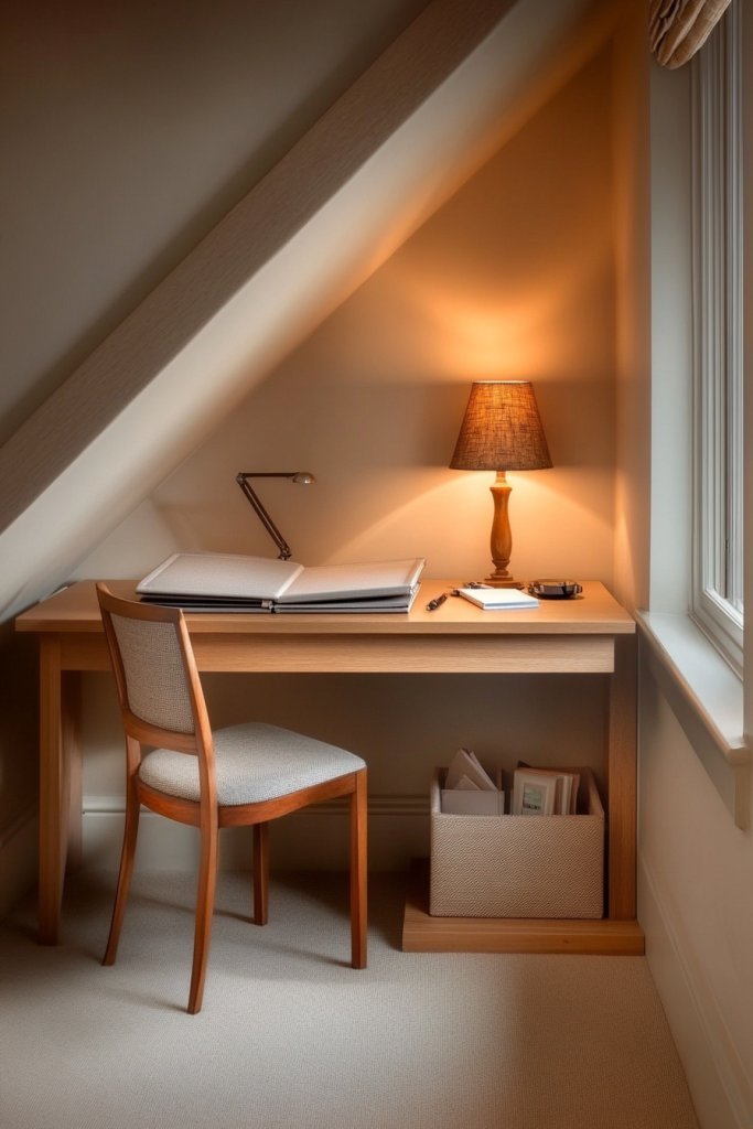 Picture a slim, built-in desk nestled into the lower part of the slant, with floating shelves above for storage and decor. The surface is clutter-free, with just a laptop or a favorite mug—everything you need at your fingertips. Soft task lighting, like a wall-mounted sconce, illuminates the workspace without taking up desk space. Clean lines and neutral tones keep it calm and focused.