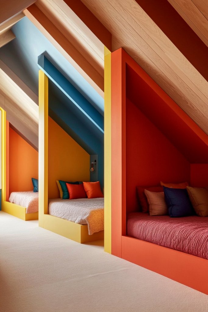 Do you find your room feels a bit scattered, especially with sloped ceilings creating visual chaos? Color blocking is an eye-catching way to segment your space into distinct zones—like sleeping, lounging, or dressing areas. It brings order and personality, making your room both fun and functional. Want to add a pop of color and structure? This idea is your new best friend.
