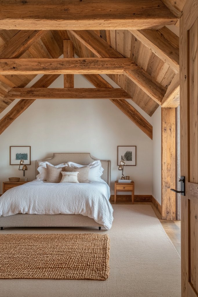 Picture exposed or faux wooden beams running across the ceiling, contrasting beautifully with light-colored walls or modern finishes. The natural grain and knots of the wood add visual interest and texture, creating a warm, organic atmosphere. When paired with plush bedding and soft lighting, it feels like a mountain lodge or countryside retreat—no matter your style.