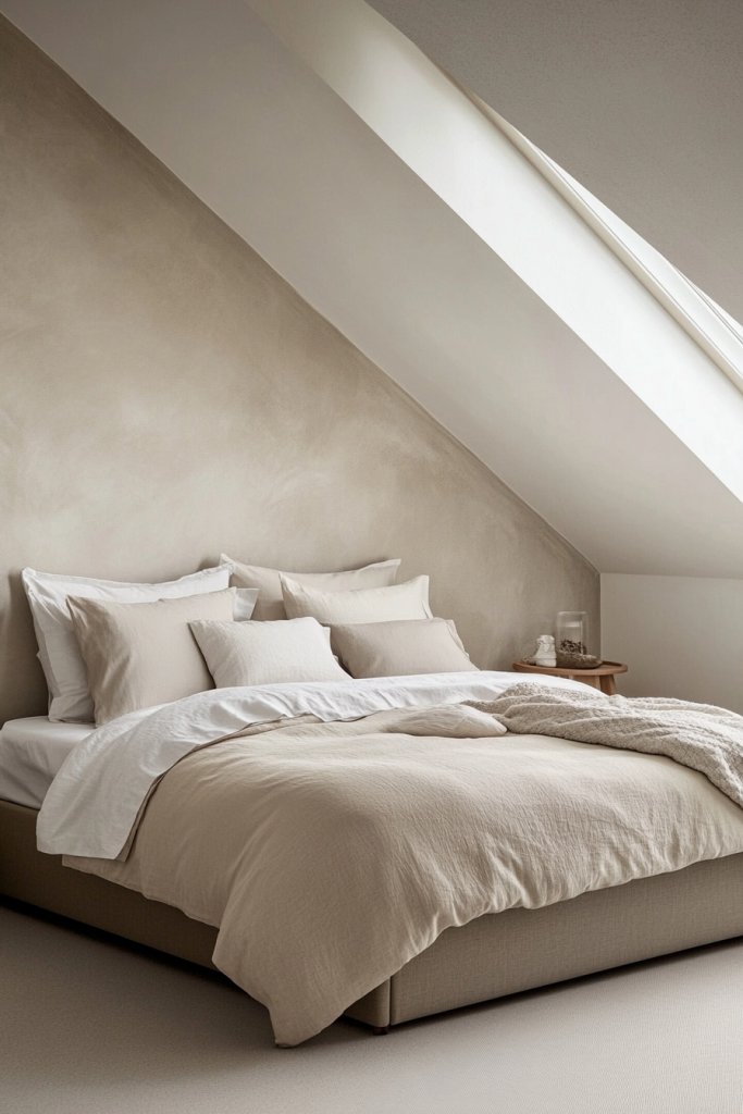 Feeling overwhelmed by loud colors or busy patterns in your bedroom? Soft, neutral tones create a calming environment that promotes relaxation and restful sleep. Especially with slanted ceilings, muted shades keep the space feeling open and soothing. Want a bedroom that feels like a retreat? This is your go-to strategy.