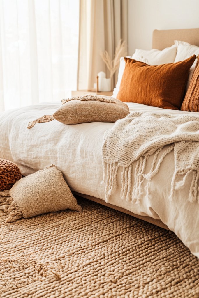Visualize a plush area rug layered with soft throws draped over the bed and a variety of cushions in different textures and sizes. Warm knit blankets, velvet cushions, and woven pillows create depth and tactile richness. The cozy textiles invite touch and snuggling, making the room feel multi-dimensional and layered. Subtle color coordination ties everything together beautifully.