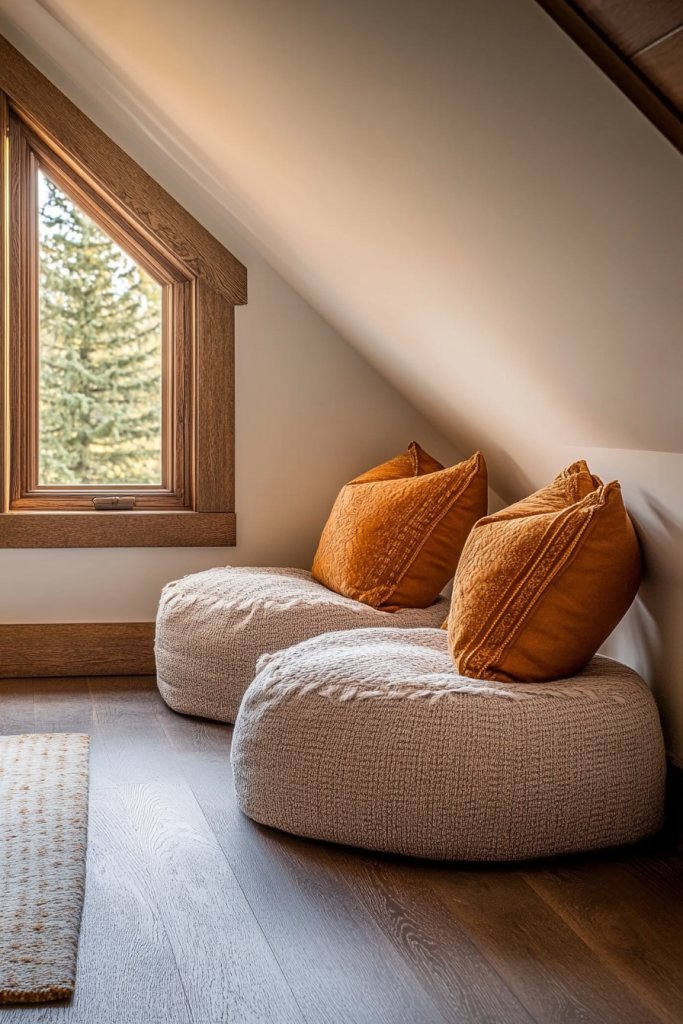 Need a cozy spot to relax, meditate, or read but short on space? A small seating area with floor cushions or poufs creates a casual, inviting nook without bulky furniture. Especially in rooms with sloped ceilings, this flexible setup maximizes comfort and style while saving space. Want a laid-back vibe? This idea is perfect.