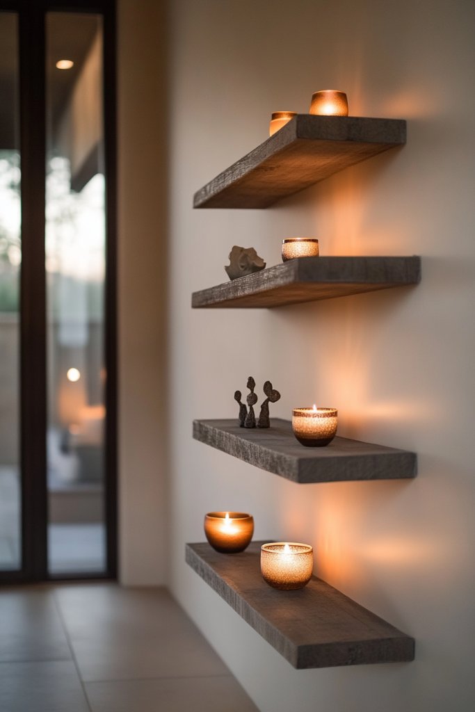 Choose shelves in different lengths, finishes, or styles—sleek glass, rustic wood, or painted MDF—to match your decor. Decorate with small, meaningful objects like travel souvenirs, tiny plants (not restricted), or handcrafted pieces. For a minimalist look, keep the display sparse; for maximalist, layer multiple items with varying heights and textures. Seasonal updates include swapping or rotating objects.