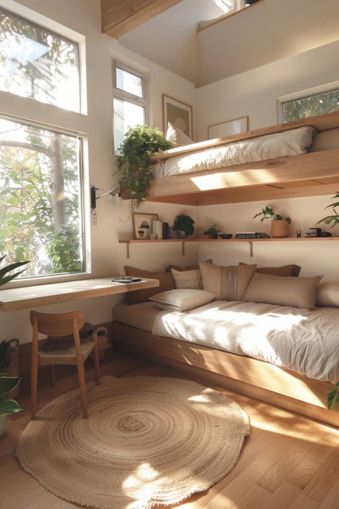 Choosing a lofted bed design not only maximizes vertical space but also adds a unique flair to your small bedroom. By elevating your bed, you’re creating valuable floor space beneath, which can be transformed into a cozy reading nook, a workspace, or additional storage. Imagine the potential of a stylish desk or shelves nestled below your elevated mattress, freeing up precious square footage.