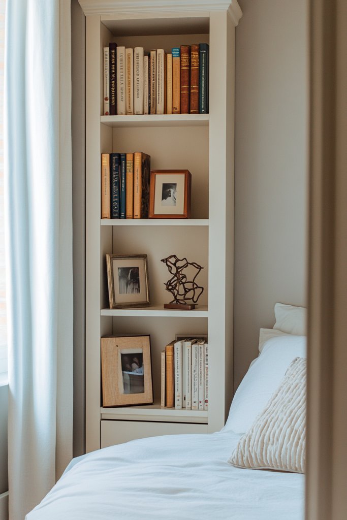 Limited space often means sacrificing storage and style. But a tall, narrow bookshelf can solve both problems, providing vertical storage that doesn’t crowd your room. It’s perfect for displaying essentials and decorative items without taking up much floor space. Who says small rooms can’t have big style?