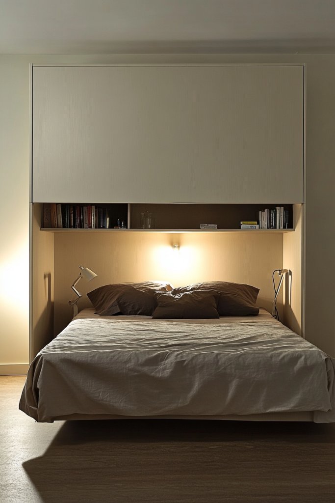 15. Use a Wall-Mounted Headboard with Built-In Shelves