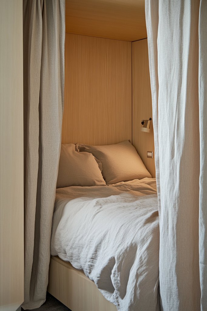 Use a fabric curtain with a sleek rod for a flexible, budget-friendly partition. For a more permanent solution, opt for a low wall or built-in half-wall to visually separate the sleeping area. Decorate the niche with textured textiles, cushions, or lighting to enhance coziness. This setup is highly adaptable—perfect for studio apartments or multi-use rooms.