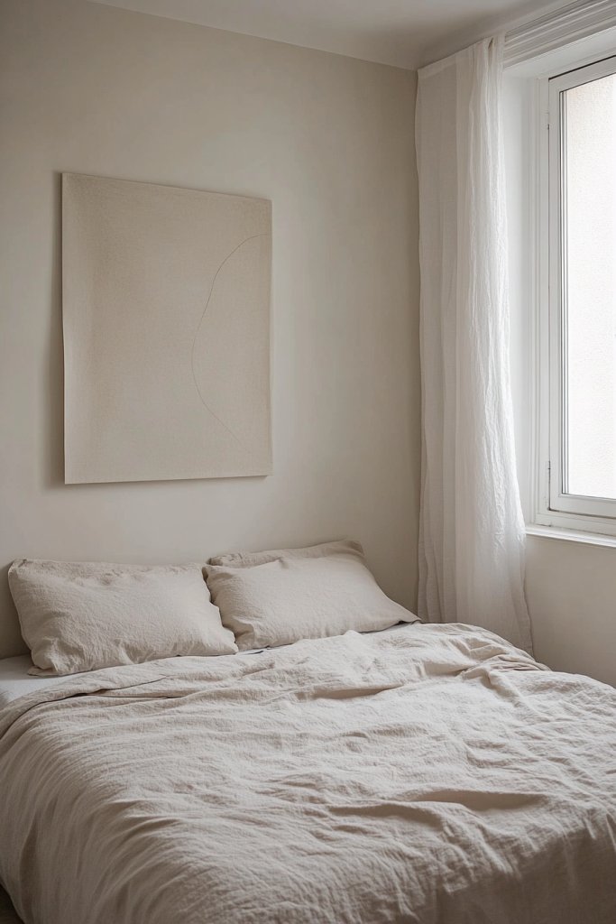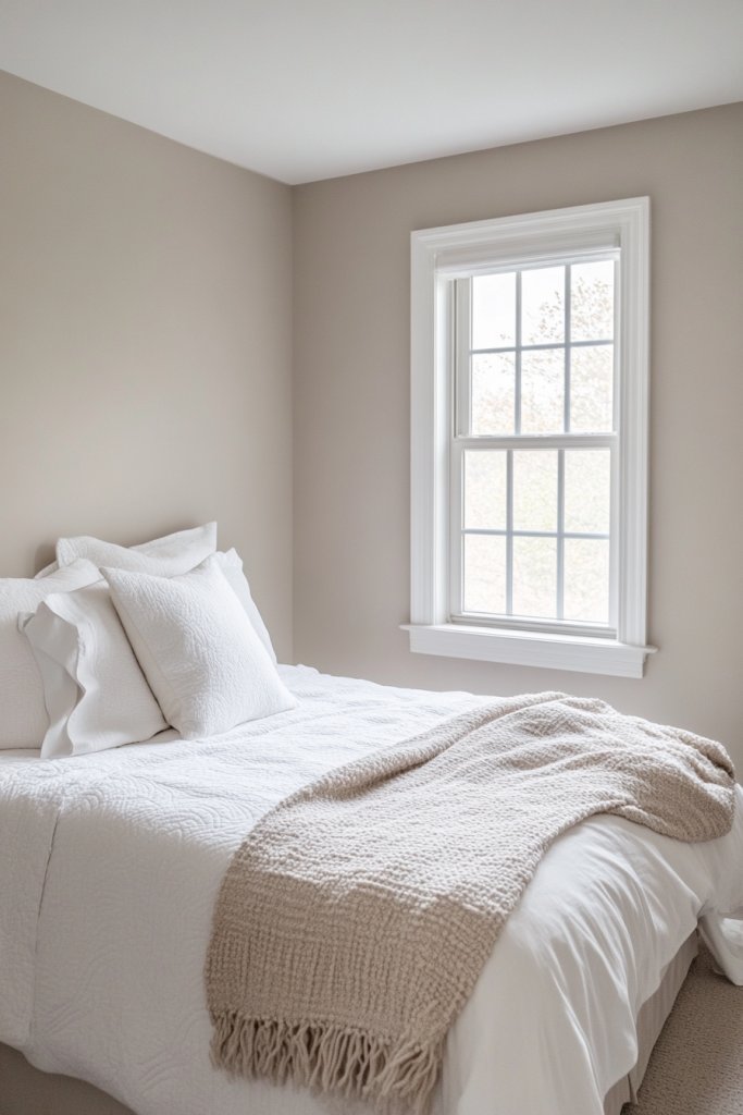 Envision walls painted in soft cream or warm beige, complemented by crisp white trim. The light color palette allows furniture and decor to pop without overwhelming the senses. Soft natural light filters in, bouncing off the walls and creating a luminous glow. The overall effect is calming, spacious, and effortlessly elegant.