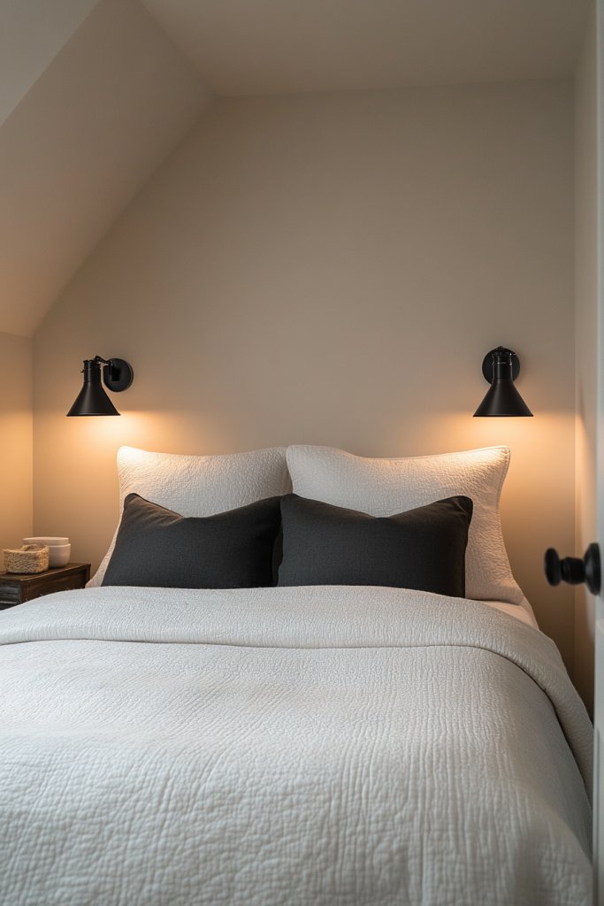 Visualize a pair of modern sconces mounted on either side of your bed, casting warm light across the room. The fixtures are minimalist, with matte black finishes and adjustable arms. Their design keeps the surfaces clear, while the soft light creates a cozy, inviting atmosphere. The room feels more spacious because there’s no bulky lamp taking up space.