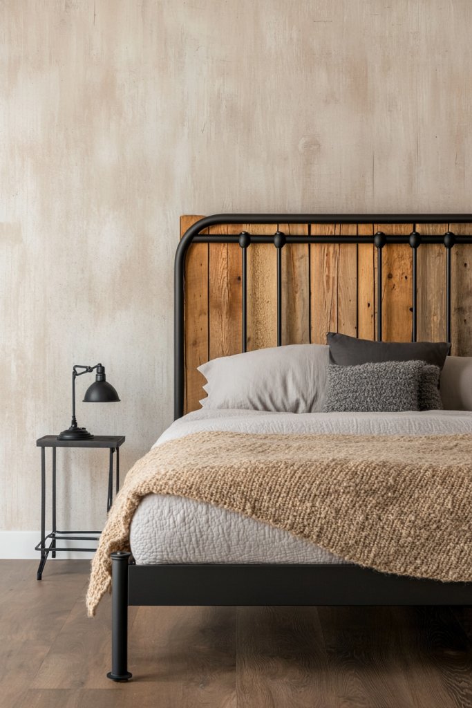 Imagine a rugged metal frame with a matte finish, paired with a reclaimed wood headboard that shows off natural grains and imperfections. The dark hues of the metal contrast sharply with the warm, textured wood, creating a balanced industrial vibe. The rough textures invite touch, and the sturdy construction anchors the room. Soft lighting highlights the raw materials, giving you that edgy yet cozy atmosphere.