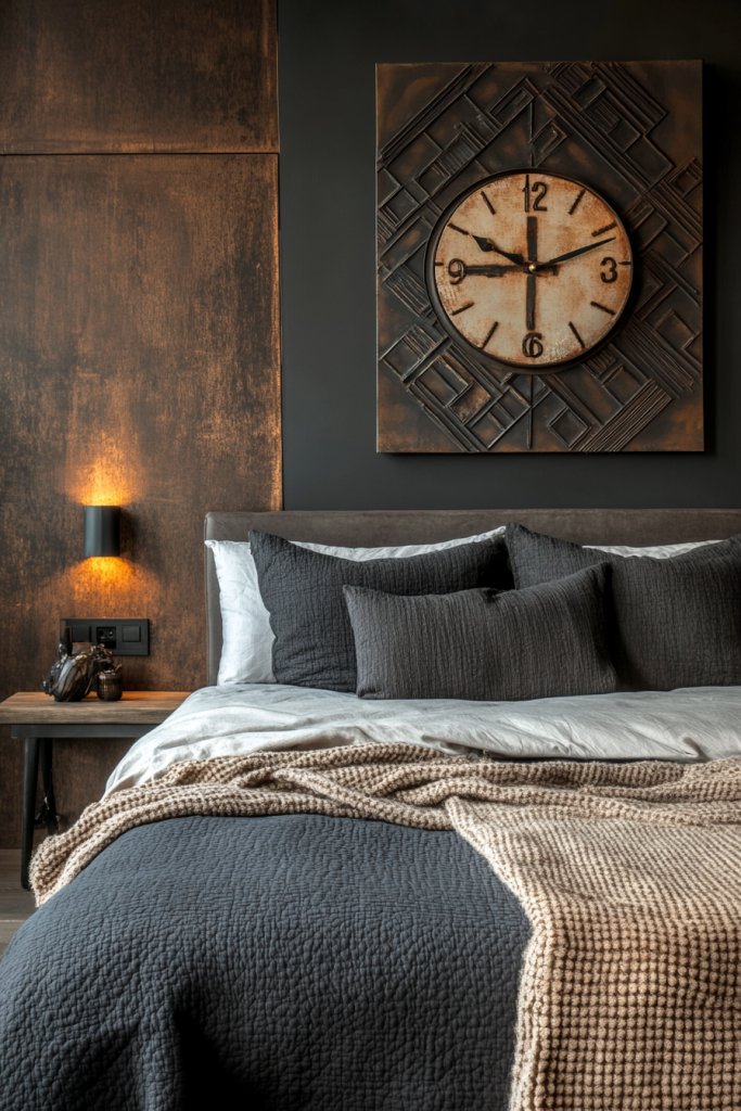 Picture a large, matte black metal clock with bold, block numerals hanging above a dark leather headboard. Nearby, angular metal wall art pieces in geometric patterns add depth and texture. The combination creates a striking focal point that balances rustic charm with industrial edge. The textures contrast nicely against matte painted walls, giving your space a gritty yet refined vibe. You can almost hear the subtle clang of metal, adding to the room’s raw personality.