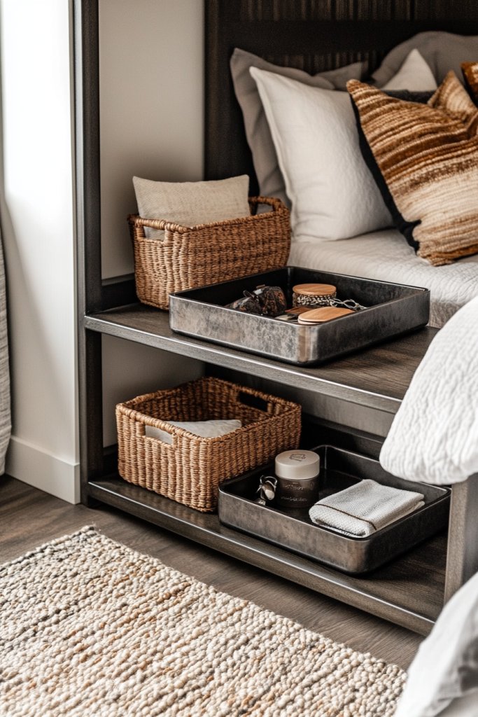 Imagine sleek, matte-black metal trays stacked neatly on open shelving, holding keys, wallets, and gadgets. Woven leather baskets sit on the floor, offering a stylish spot for laundry or extra blankets. The textured surfaces contrast with smooth, industrial-style furniture, creating an edgy yet organized vibe. Small labels or tags add a touch of personality, making everything feel intentional and tidy.