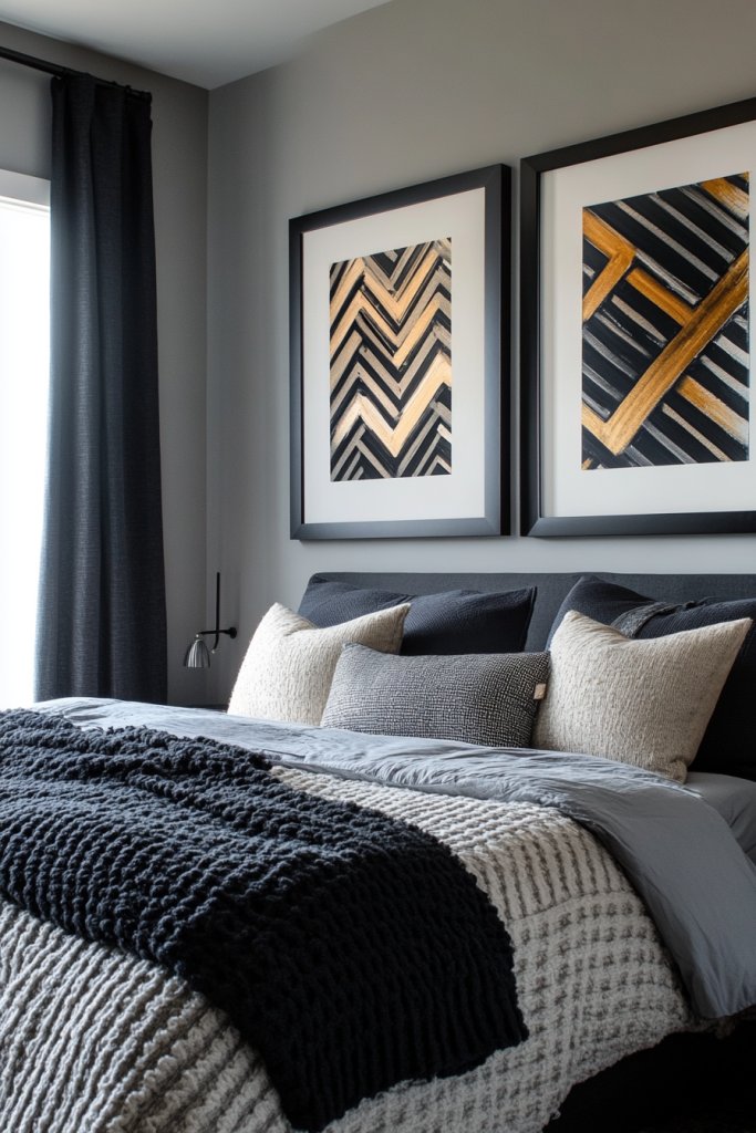 Picture a large, dark-framed abstract print hanging above your bed or dresser, commanding attention. The artwork features deep, moody colors—charcoal, navy, or muted earth tones—that complement your masculine palette. The textured surfaces and bold lines create a sense of depth and strength, making your wall a focal point. The frames themselves are industrial-style, with raw metal or dark wood, adding to the room’s edgy aesthetic.