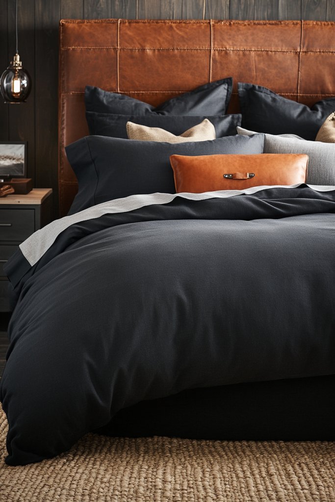Imagine crisp, dark-colored sheets paired with a soft cream throw blanket with chunky knit texture. Leather pillows or a leather headboard add richness and tactile appeal. The contrast between smooth fabrics and rugged leather creates a balanced look that’s both masculine and sophisticated. The muted tones and minimal layering keep the space uncluttered, yet inviting.