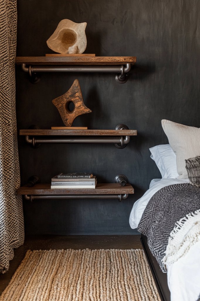 Picture black metal pipes mounted on the wall, supporting wooden planks in dark or weathered finishes. The open shelving displays essentials like books, gadgets, or decorative objects—no clutter, just curated masculinity. The raw metal contrasts with warm wood tones, creating an industrial-modern aesthetic that’s both practical and visually striking. The pipes themselves add a sculptural element, emphasizing strength and durability.