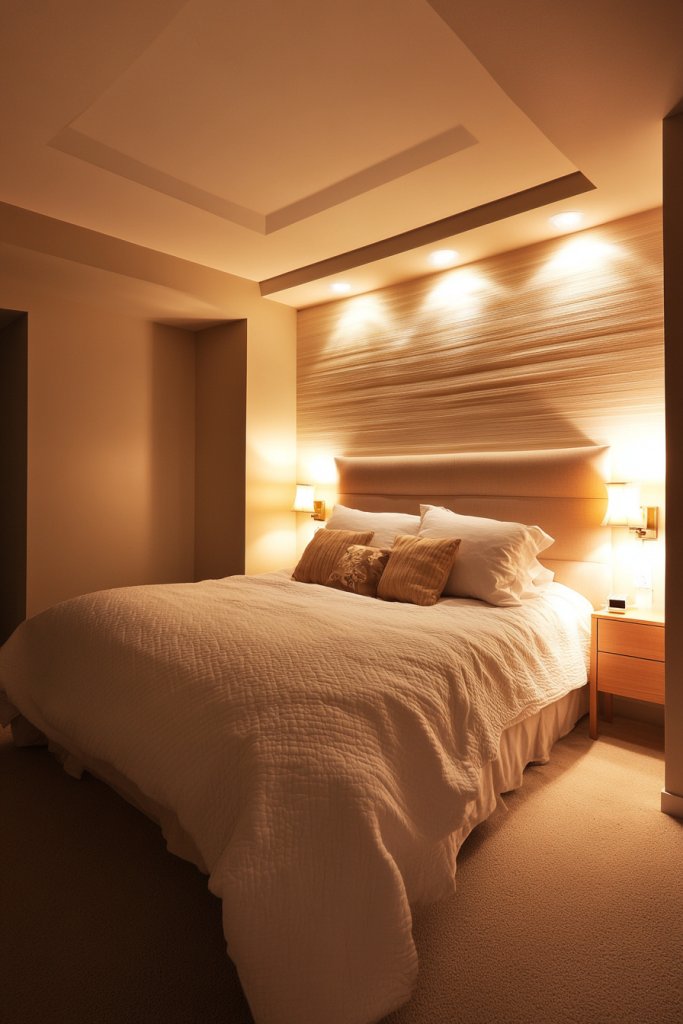 Picture a softly lit ceiling fixture providing general illumination, complemented by wall sconces or clip-on lights for task lighting. Add string lights or LED strips behind furniture or along shelves for subtle accent lighting. The layered glow creates a warm, inviting atmosphere and makes the room feel more expansive. The different sources work together to eliminate dark corners.
