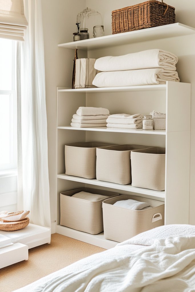 Envision woven baskets on shelves, fabric bins under the bed, and stackable boxes on top of dressers—all in neutral tones or matching colors. These containers keep your belongings contained and accessible. The room looks tidy, and the visual clutter disappears, making the space feel bigger and calmer.
