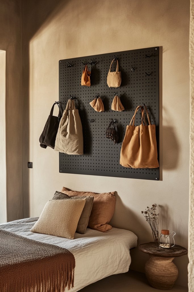 Imagine a sleek black pegboard above your dresser, holding your jewelry, hats, or bags neatly hung. Hooks and baskets keep everything accessible and tidy. The wall feels purposeful and organized, with everything in its place. This setup also adds a modern, industrial edge to your room’s style.