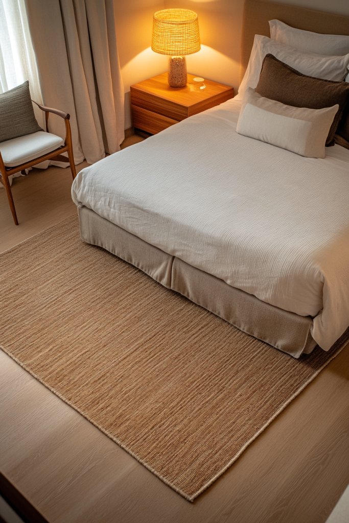 Picture a soft, plush rug in a neutral tone placed under your bed, extending beyond the sides for a cozy effect. The texture invites you to walk barefoot, and the color complements your walls and textiles. You can add smaller rugs in front of the closet or beside the bed to create distinct areas. The room looks layered, warm, and thoughtfully designed.