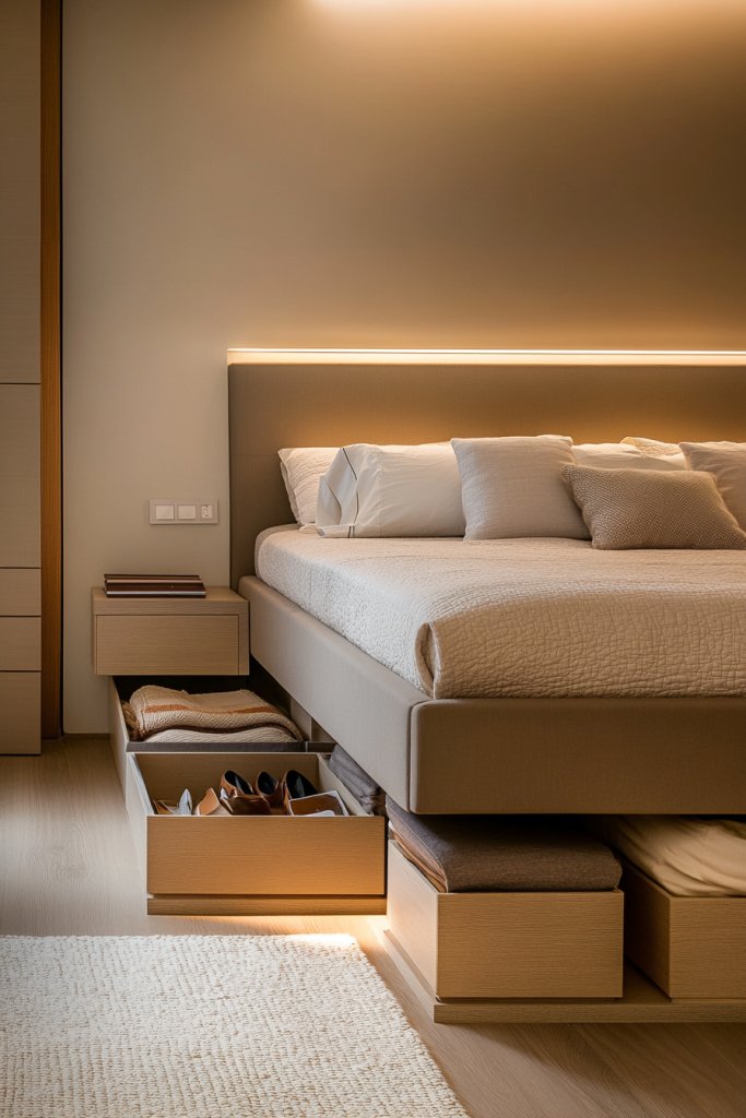 Picture a low-profile bed with sleek, rolling bins or drawers underneath. These containers are in neutral colors that blend with your flooring, maintaining a clean look. When you slide out a bin, it reveals neatly folded clothes or accessories. The entire space feels more organized, and the room instantly looks bigger and less chaotic.