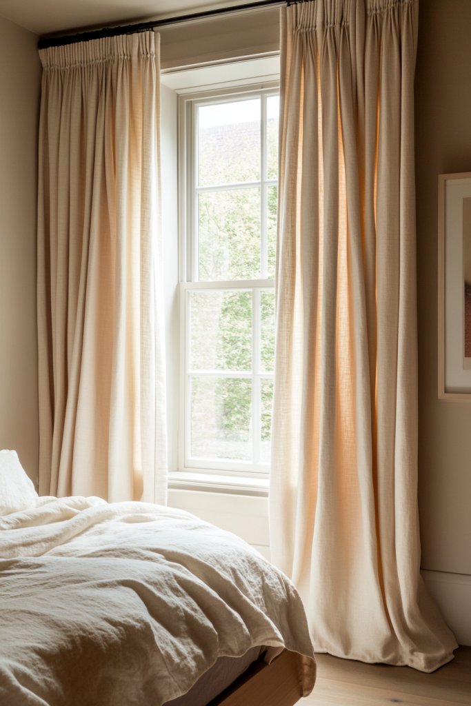 Imagine long, flowing curtains in a light, airy fabric that start just below the ceiling and extend to the floor. The curtains in a soft neutral tone cascade elegantly, emphasizing the room’s height. When you draw them back, the windows appear larger, and the room feels more expansive. The effect is both cozy and grand.
