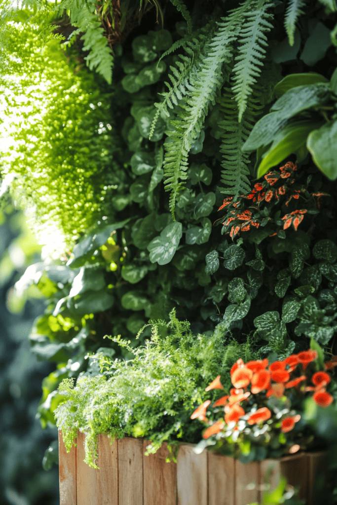 Consider using a range of plants, from ferns to succulents, to add texture and color. You can install pocket planters or a modular system for easy arrangement. Don’t forget to include a drip irrigation system; it’ll simplify watering and keep your plants healthy.