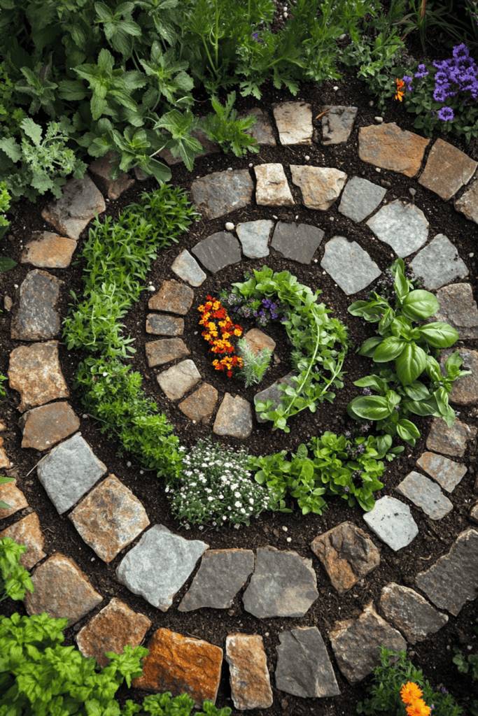 Fill the gaps with soil and plant herbs like basil, thyme, and mint along the spiral. The top will be drier and sunnier, perfect for drought-tolerant plants, while the bottom retains moisture for more water-loving varieties.
