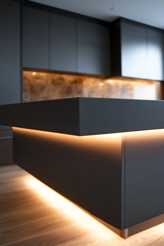 Visualize a wall-mounted or cantilevered island that appears to float with no visible supports. Soft LED lighting under the surface highlights the workspace and adds ambiance. The surface could be a polished stone, glass, or sleek laminate that reflects light. The combination of modern materials and lighting creates a clean, airy atmosphere.