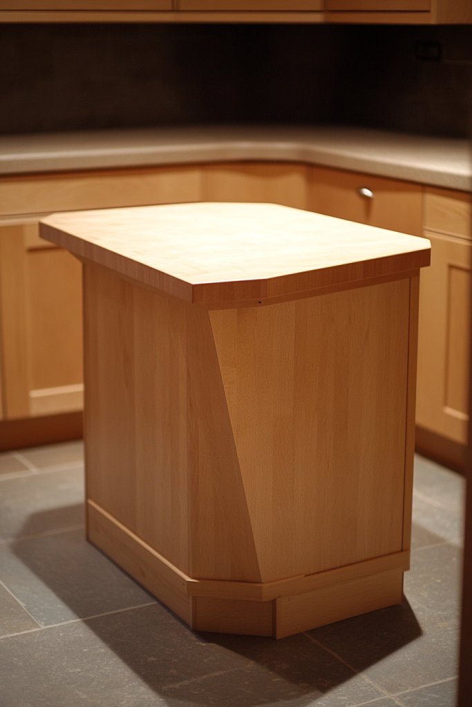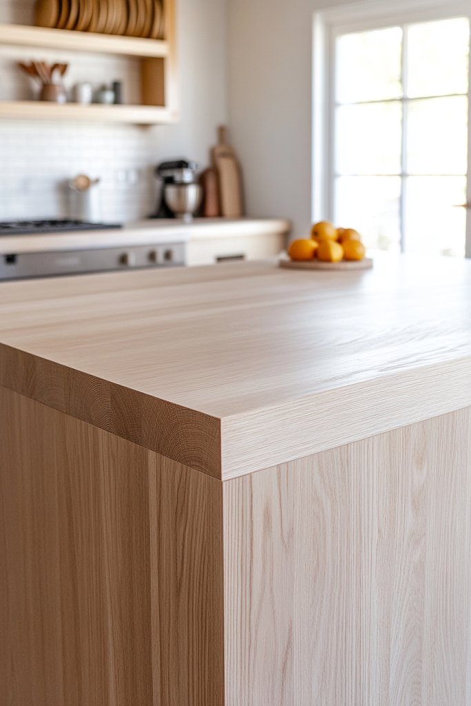 Visualize a sleek, pale wood island with a smooth surface and unobtrusive hardware. The light finish reflects natural light, making the space feel larger. Open shelving or hidden cabinets keep clutter out of sight. Soft textiles or subtle decor accents enhance the serene vibe. Natural textures and minimal ornamentation define the aesthetic.