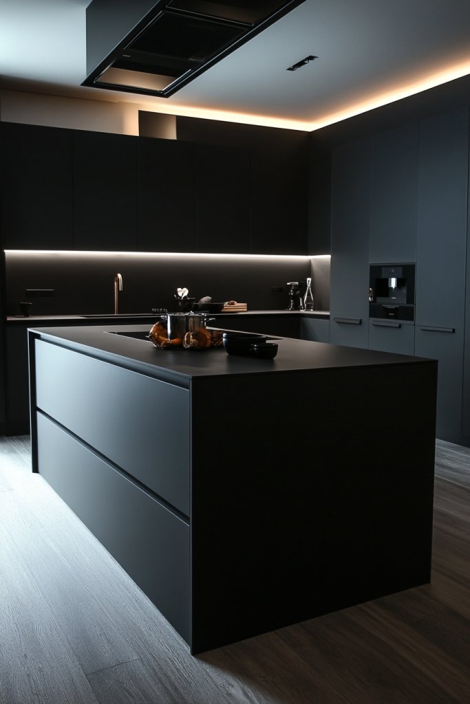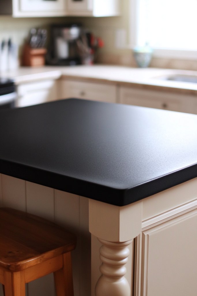 Picture a streamlined island in matte black, charcoal, or soft gray. The matte finish absorbs light, reducing glare and adding depth. The surface is smooth and seamless, with hidden hardware for a clean look. Complement it with matching cabinetry and subtle hardware for a unified aesthetic. Soft lighting enhances the muted tones.