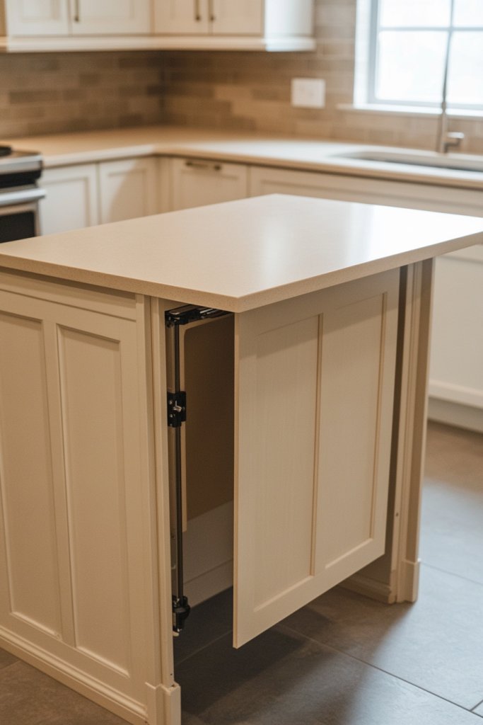 Visualize a sleek, minimalist island with a hidden fold-down panel on the side. When lowered, it becomes a sturdy surface for meals or additional prep. When folded up, it blends seamlessly with the rest of the cabinetry. Use a matching finish or a contrasting color to make it stand out or disappear as desired. Soft lighting highlights the functionality.