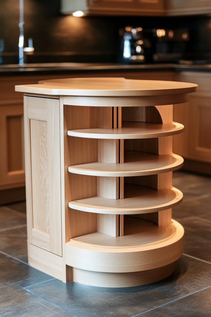 Imagine a slim, vertical island with a circular top and rotating tiers underneath. Each shelf spins smoothly, revealing spices, utensils, or small tools. The design maximizes storage in tight quarters and adds a playful, functional element. Brightly colored or metallic finishes make it a standout feature.