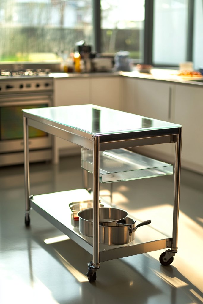 Imagine a sleek, sturdy cart on smooth casters, topped with a durable stone or wood surface. Its shelves are filled with neatly stacked bowls, utensils, and small appliances, ready for action. You can roll it over to your cooking zone or tuck it away when not in use. Bright colors or matte finishes bring a modern vibe that keeps the space lively.