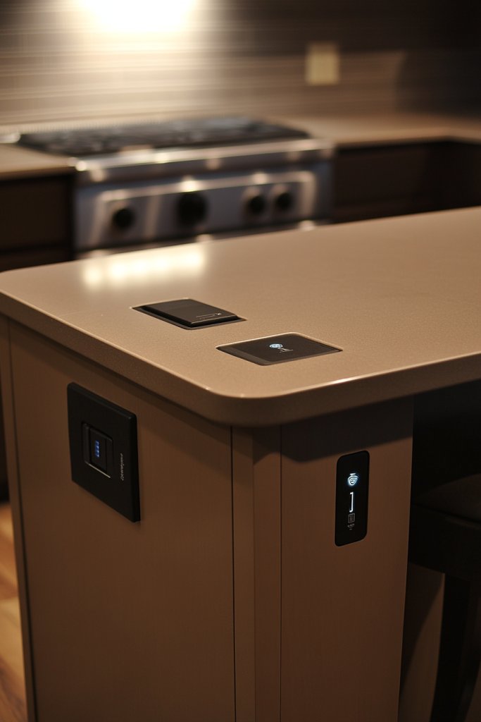 Picture a sleek island with a hidden power strip or built-in USB ports integrated into the side or surface. The surface is durable and easy to wipe clean—like quartz or sealed wood. Discreet outlets keep clutter out of sight, while a small area for devices adds convenience. Soft, warm lighting highlights the tech features.