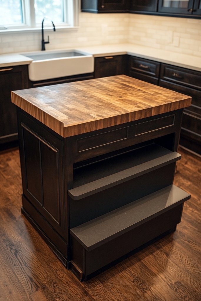 Imagine a compact island with a fold-down or extendable tabletop that can be used for meals, prep, or even as a workspace. When not in use, it folds away neatly against the wall or cabinet. Use a sleek finish—like lacquer or sealed wood—to match the rest of your decor. Bright, functional lighting makes it inviting.