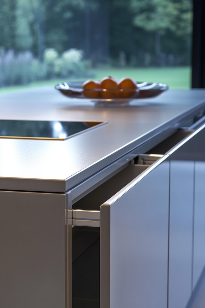 Choose high-quality, matte-finish materials like laminate, lacquer, or powder-coated metal. Ensure the surfaces are durable and resistant to fingerprints or smudges. Install handleless drawers or push-to-open mechanisms for a seamless look. Pair with matching countertops—like quartz or concrete—for durability. Keep the overall design simple and uncluttered.