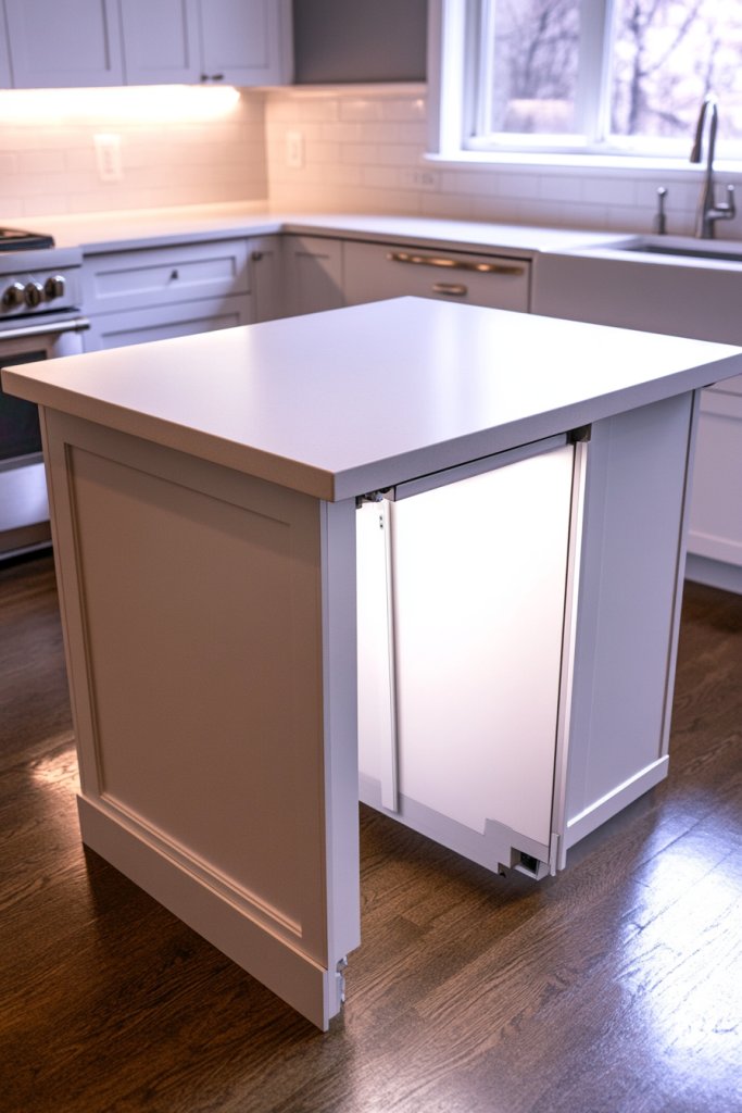 Picture a sleek island with cabinet doors that hide a pull-out trash can and recycling bins. The surface is durable and easy to wipe clean, perfect for chopping and prep. The bins are designed to be discreet yet accessible, with a soft-close mechanism that prevents slamming. When closed, the island looks seamless and clutter-free.