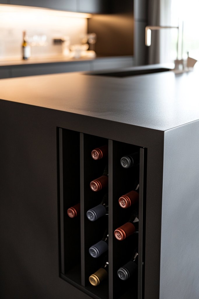 Picture a streamlined island with smooth, matte cabinetry and a quartz or concrete top. A vertical wine rack is seamlessly integrated into the side, holding bottles at an angle. The clean lines, neutral tones, and subtle hardware create a sophisticated, clutter-free look. Soft under-cabinet lighting highlights the storage without overpowering the space.