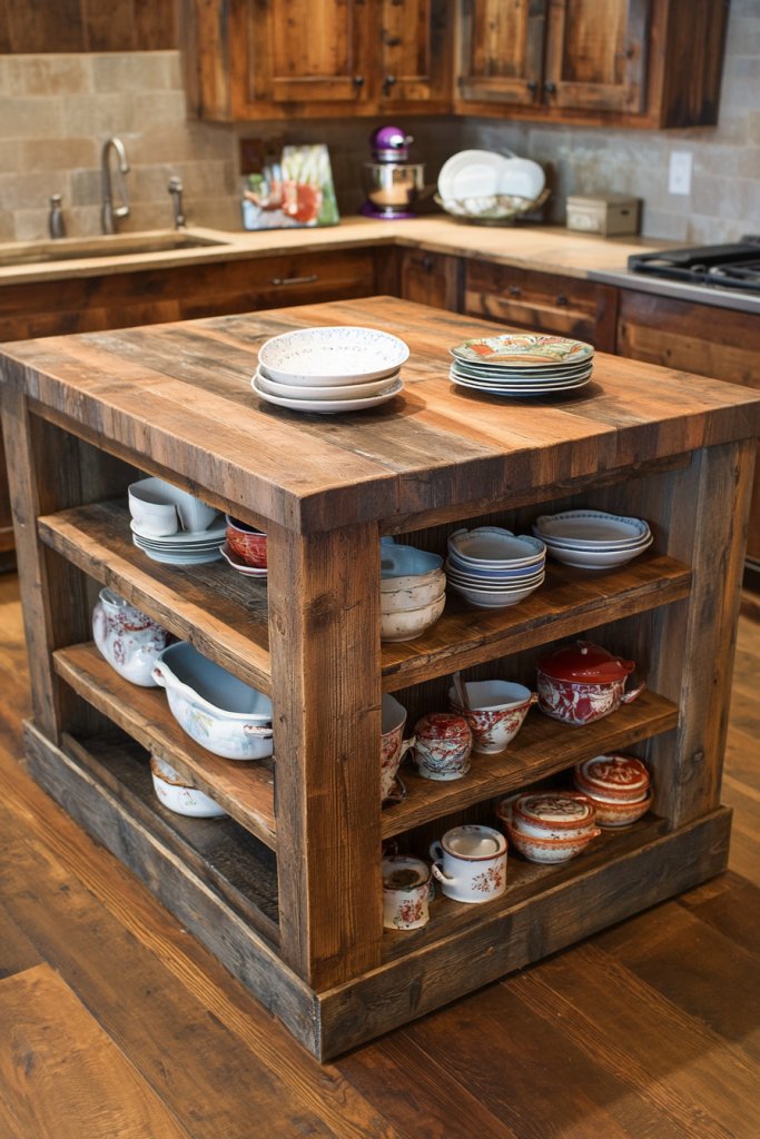 A rustic wooden island with open shelves brings a warm, lived-in feel to your kitchen. It’s functional and full of character, making everyday cooking a joy. Once styled, it becomes a conversation piece that reflects your personality and taste. Ready to add some countryside charm?