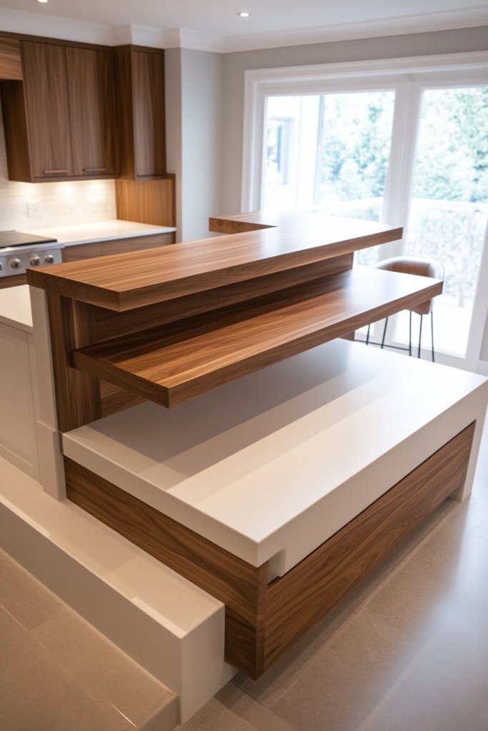Picture a sleek, dual-level surface with a lower section for chopping and prepping, and an upper bar-height section for casual dining. The different heights create visual interest while defining zones. Use contrasting materials—like a wood lower deck with a stone or quartz upper—to add texture. Pendant lights or sleek fixtures hang above, framing the space.