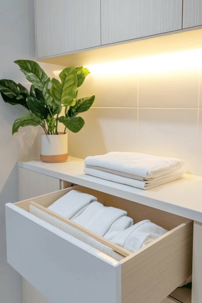 While it might seem challenging to keep a small laundry room tidy, designing a hidden laundry hamper can work wonders for both aesthetics and functionality. Think about incorporating a stylish cabinet or a bench with a lift-top that cleverly conceals your laundry. This not only keeps your dirty clothes out of sight but also adds a functional piece to the room.