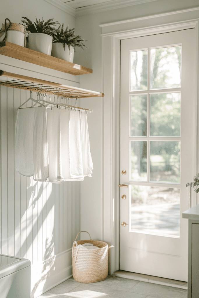 To make the most of your limited space, consider adding a drying rack over the door in your laundry room. This clever solution maximizes vertical space and keeps your floor clear. You can easily find foldable racks that attach securely above the door, providing a convenient spot for air-drying delicates or freshly laundered items.