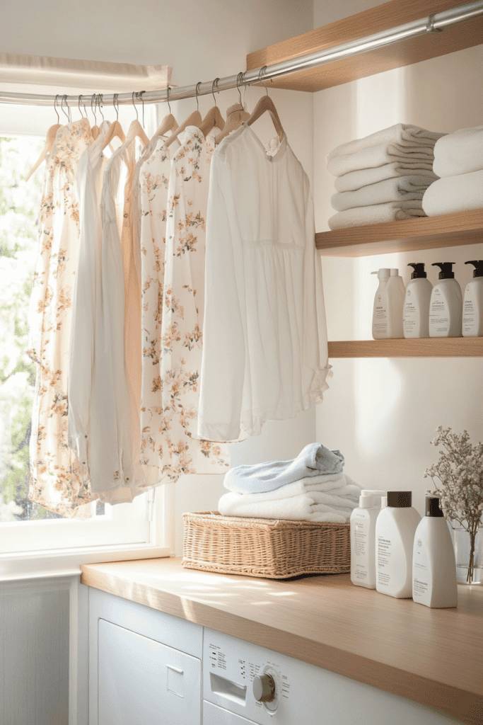 One clever solution for small laundry rooms is to install a tension rod for hanging clothes. This simple addition can transform your space, giving you a designated area to air dry delicate garments or hang outfits that need a little freshness. You can easily fit a tension rod between walls or inside a closet, maximizing vertical space without taking up any floor area.